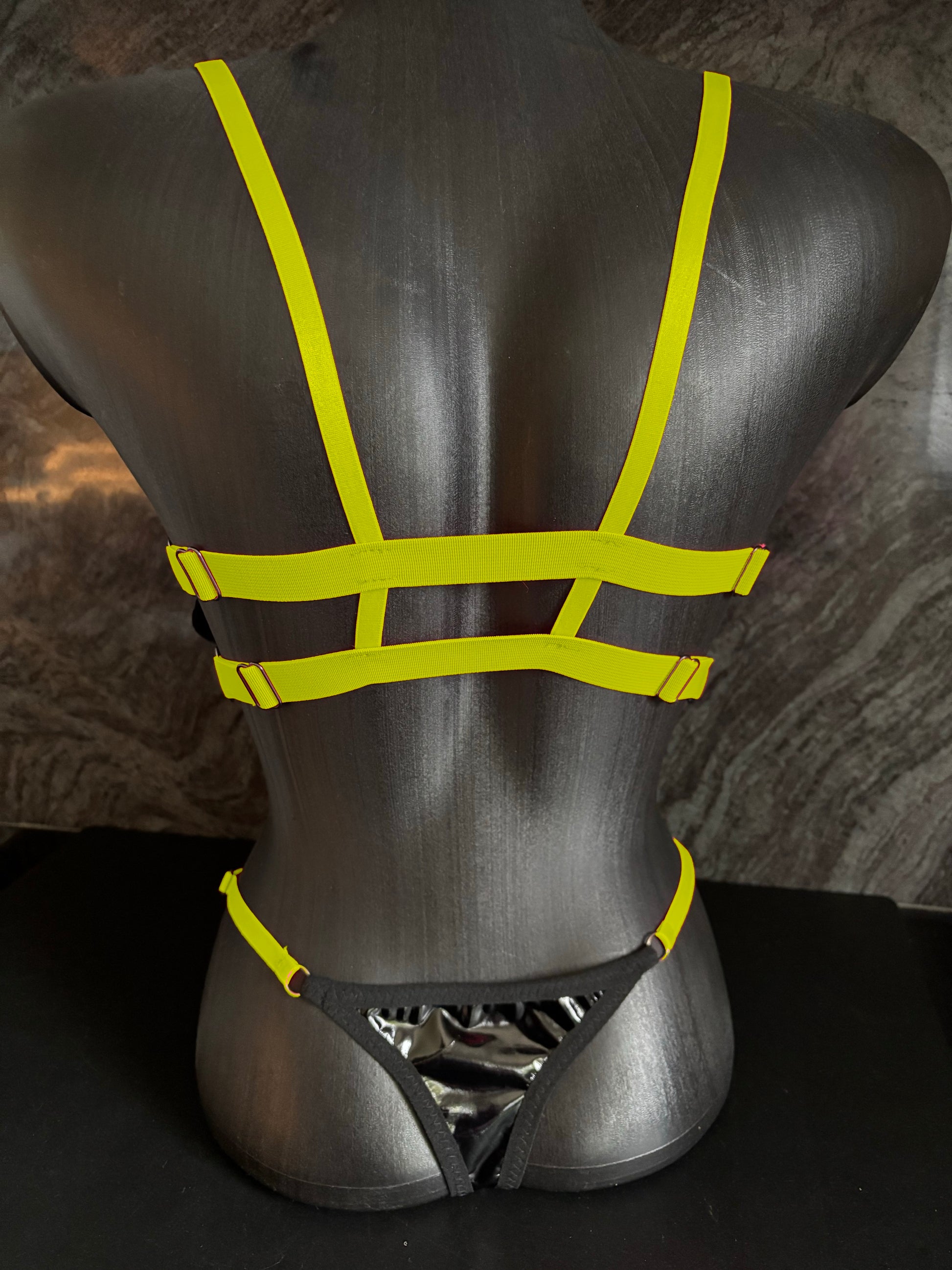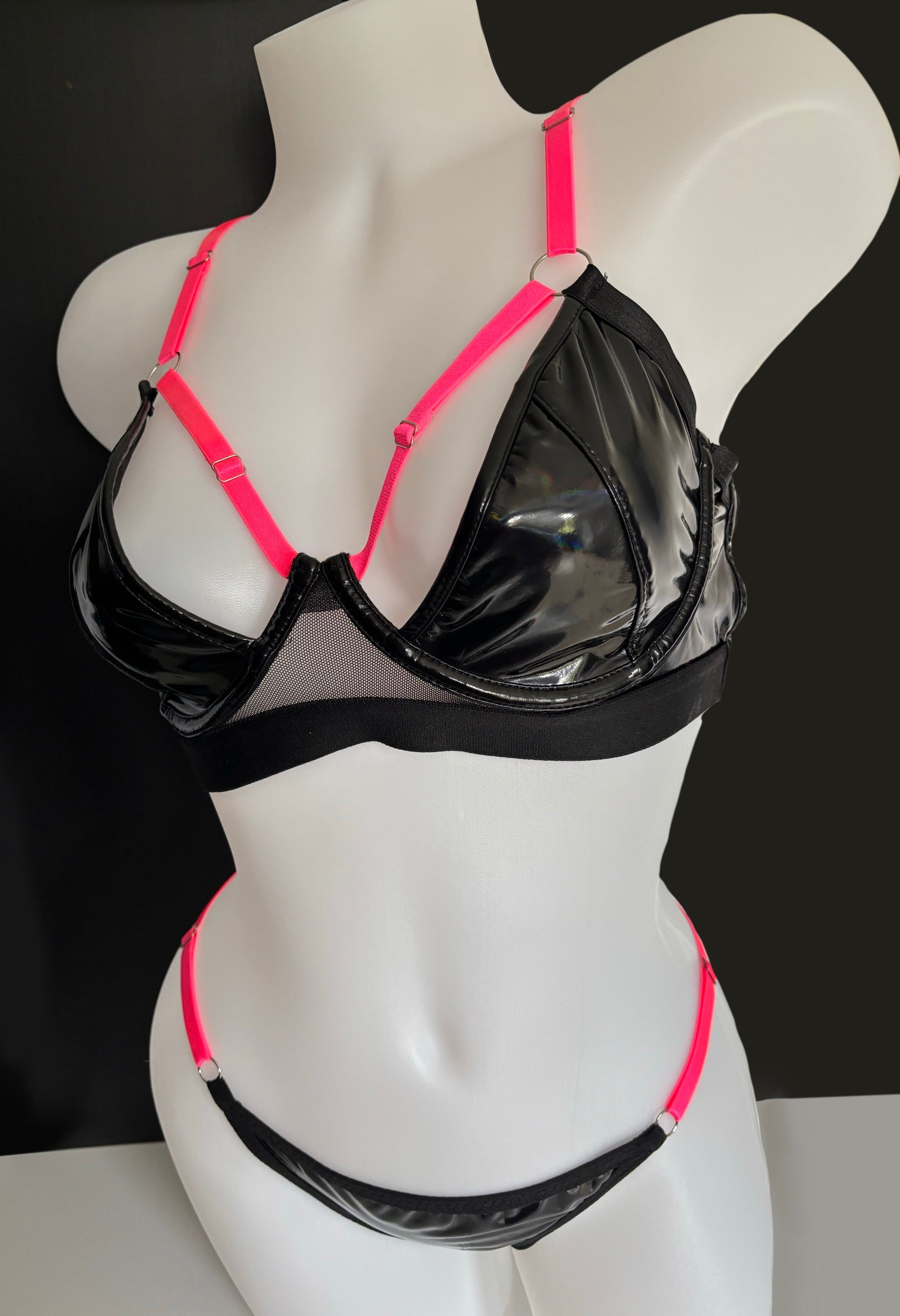 The patent-look cups give you a powerful, seductive look, while the adjustable neon straps accentuate your curves in just the right places. The matching thong completes the look — minimalist, flirty, and 100% tease-approved. 😈
