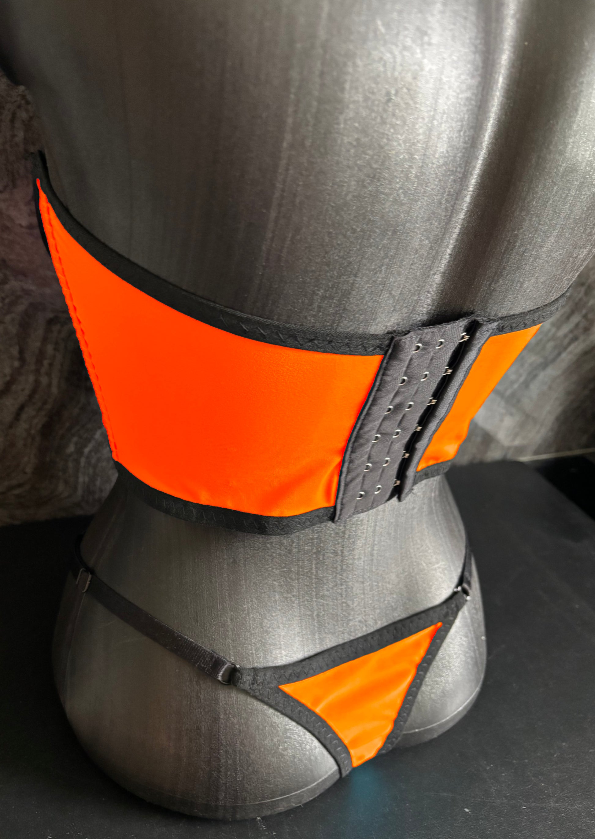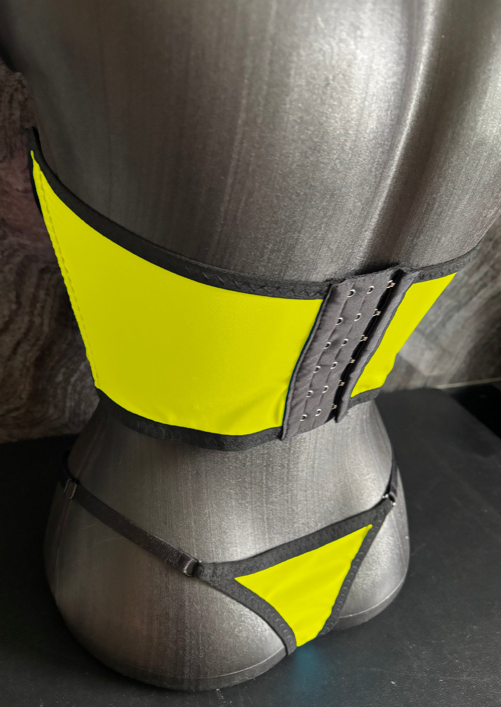 This set includes a daring neon top (with underwire!) with black accents, a matching thong and black nipple stickers – everything you need to shine in the club or in the bedroom.