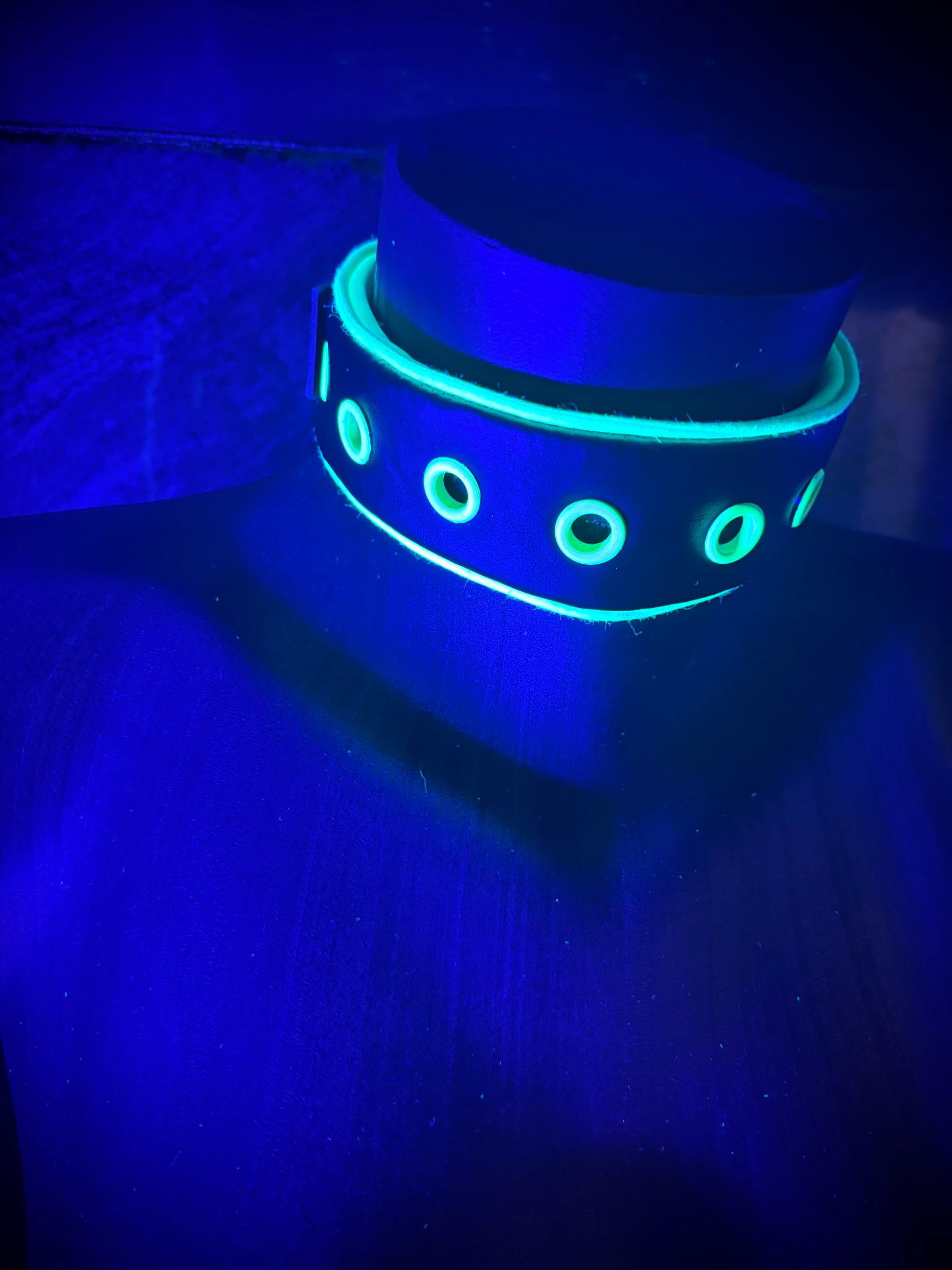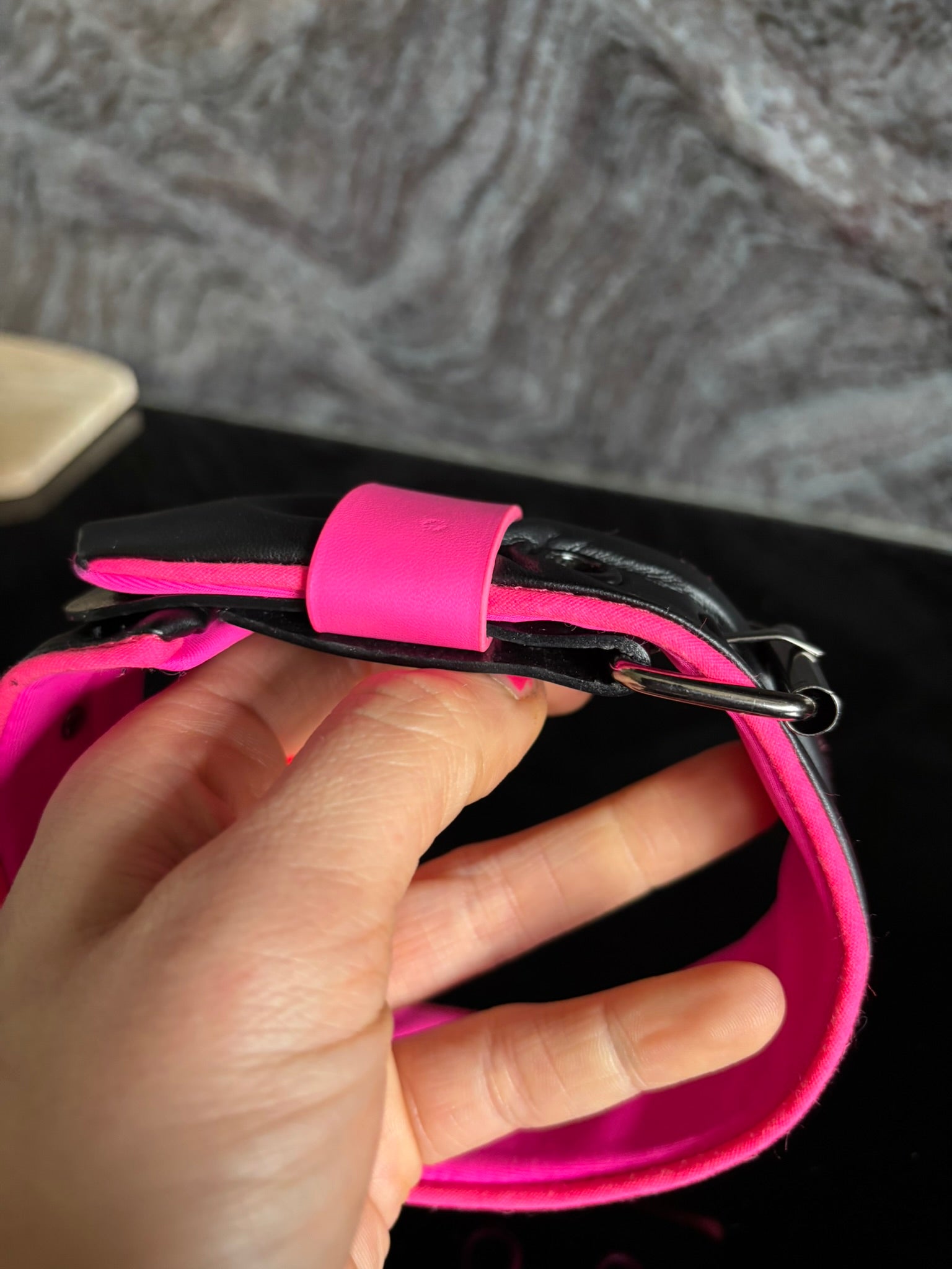 Ce collier ras-du-cou exclusif Black 'n Pink , léger et doux, allie élégance robuste et finition luxueuse. Le devant est réalisé en cuir noir pour un look épuré et minimaliste. Le dos est orné d'un doux tissu rose fluo qui offre un contraste ludique et est très confortable contre le cou (sans être chaud !).