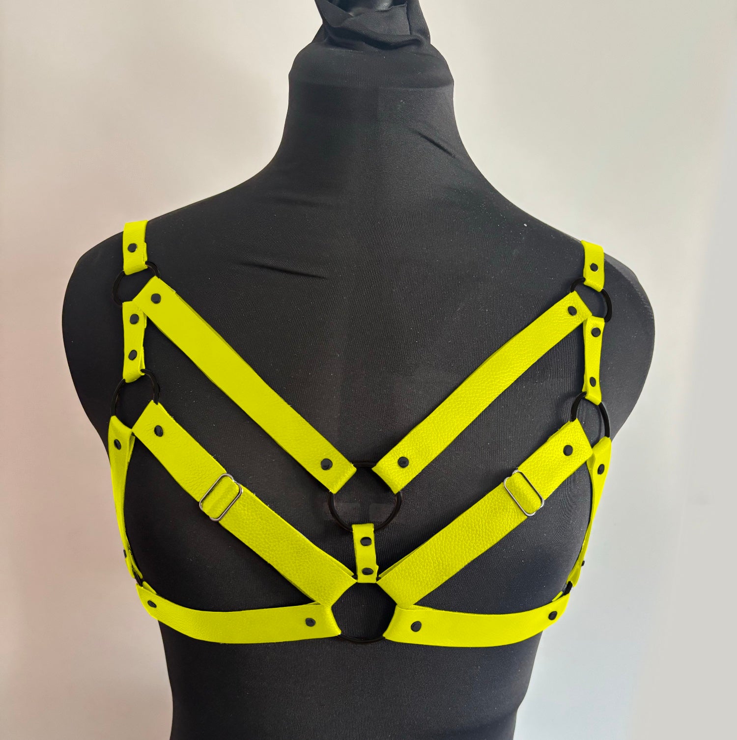 ✨ Deux harnais jaune fluo faits main – entièrement en cuir véritable, avec des anneaux en métal noir et une finition méticuleuse à la main. Chaque harnais est unique et nécessite des heures de travail artisanal.