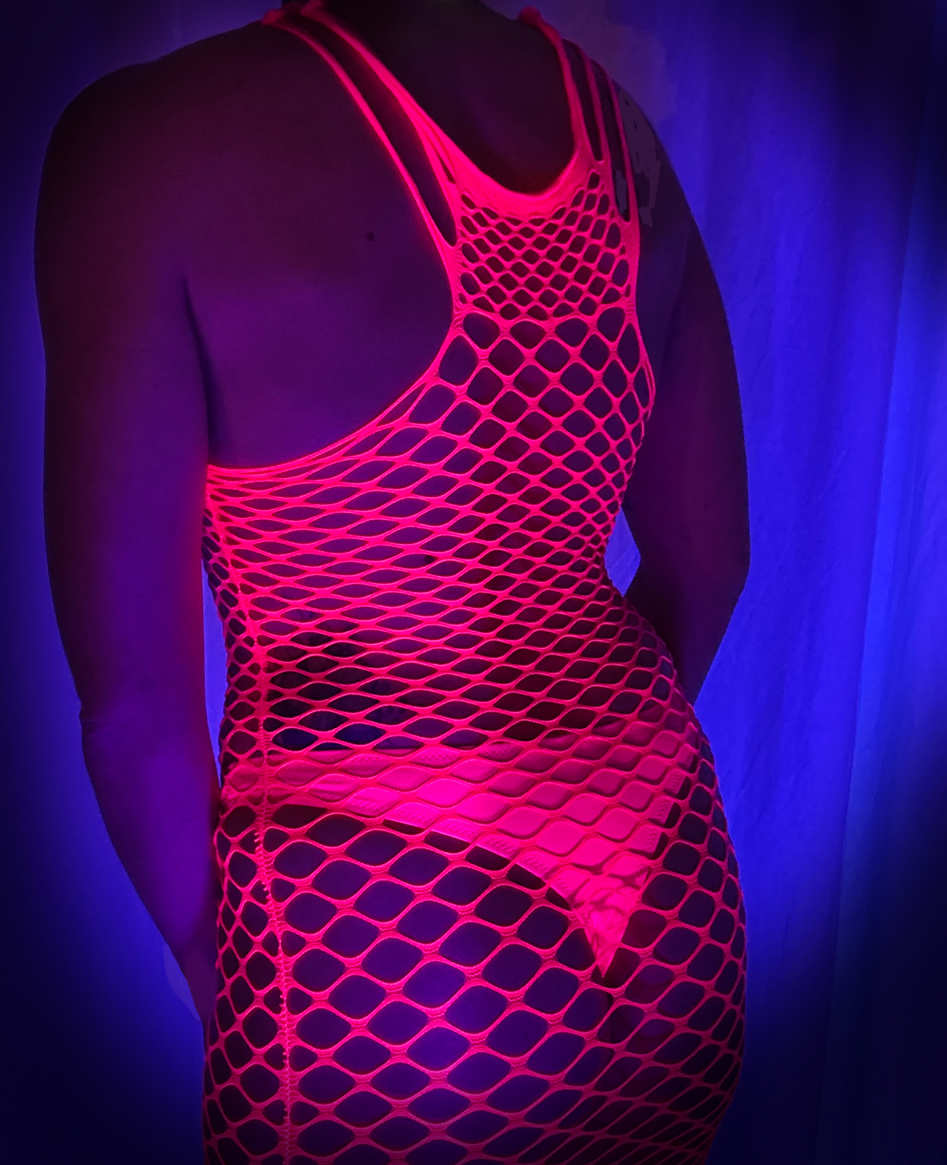Libérez votre côté FLURT avec cette robe résille rose fluo, conçue pour épouser parfaitement vos courbes. Son tissu résille extensible et doux met en valeur les zones clés de votre silhouette, et sa couleur réactive à la lumière noire fera de vous le centre de l'attention à chaque soirée.