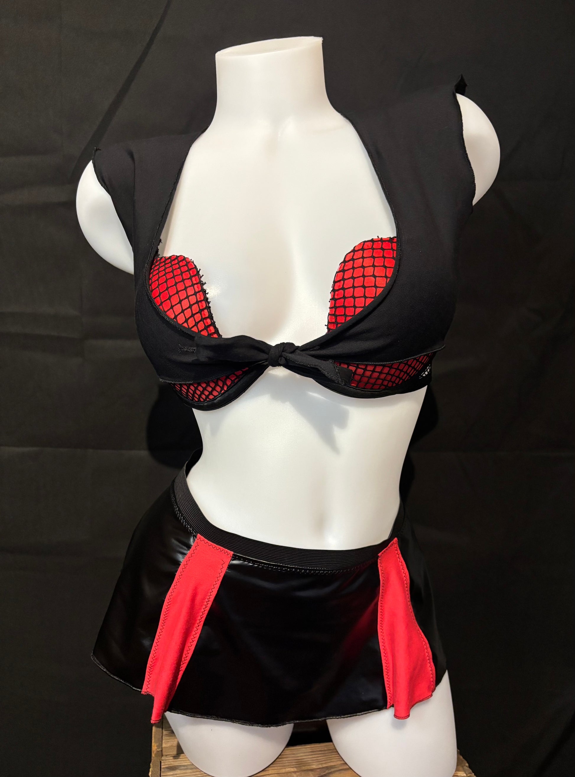 De Red Temptation Set is een combinatie van zwart met rood. BH + string of een complete tease-look die speelt met contrast. Zwart als de basis. Rood als waarschuwing.